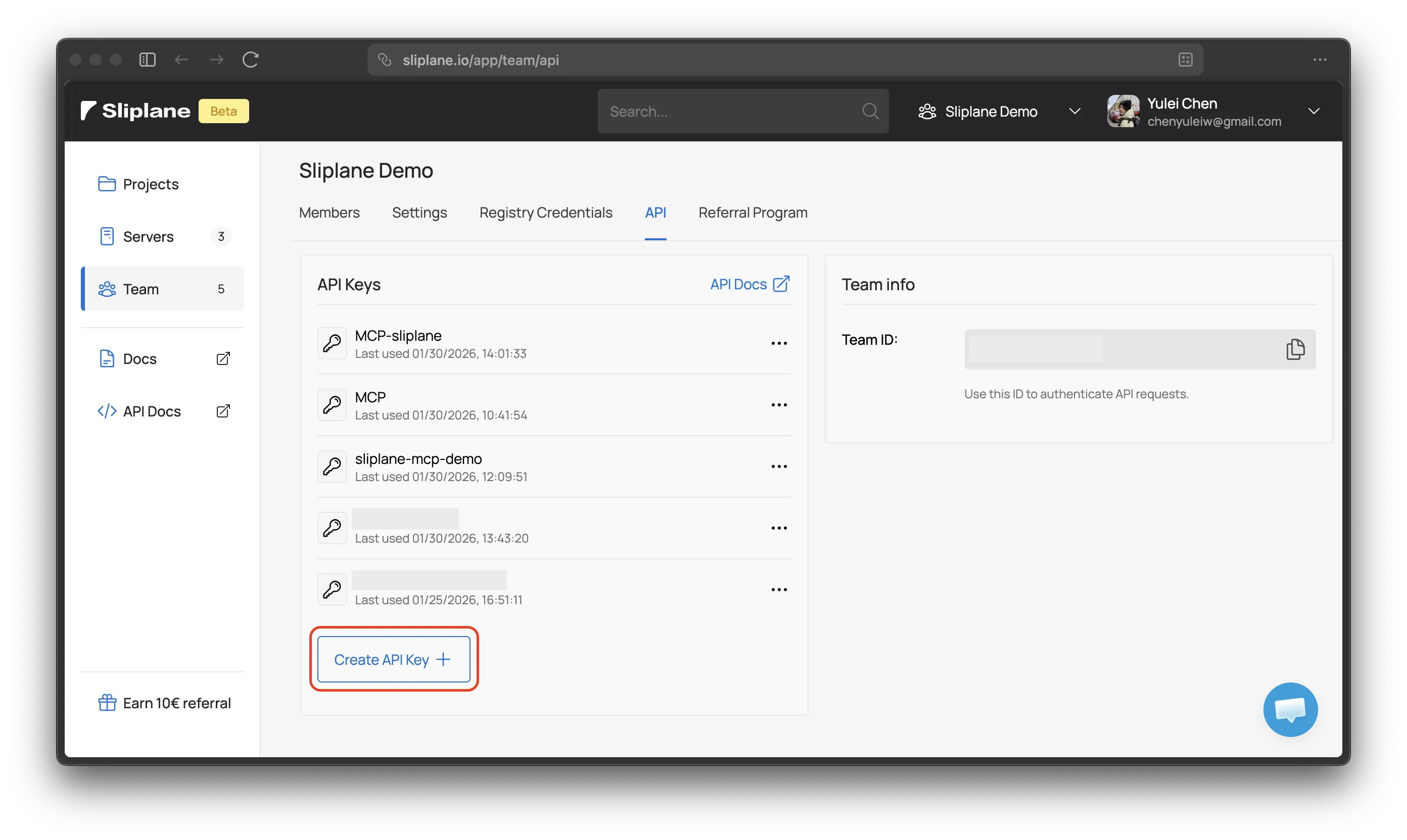 To add Sliplane MCP server, paste the following code into the file. Remember to replace the placeholder with your API Key.